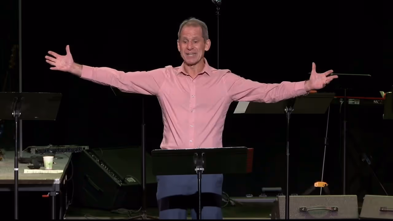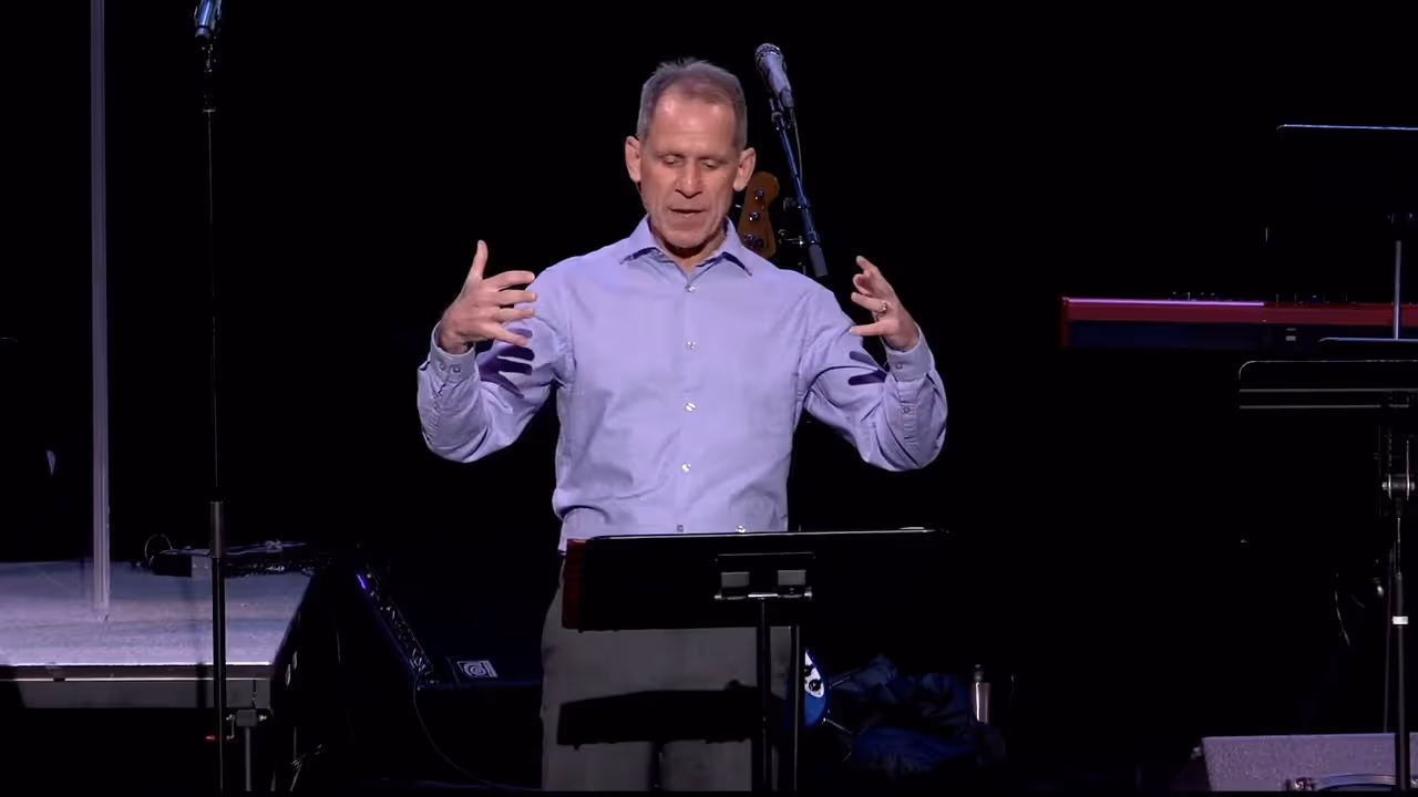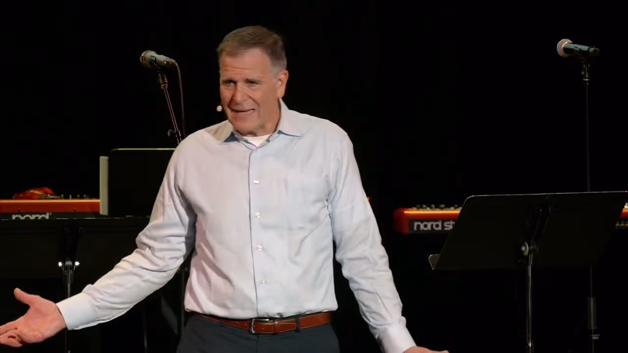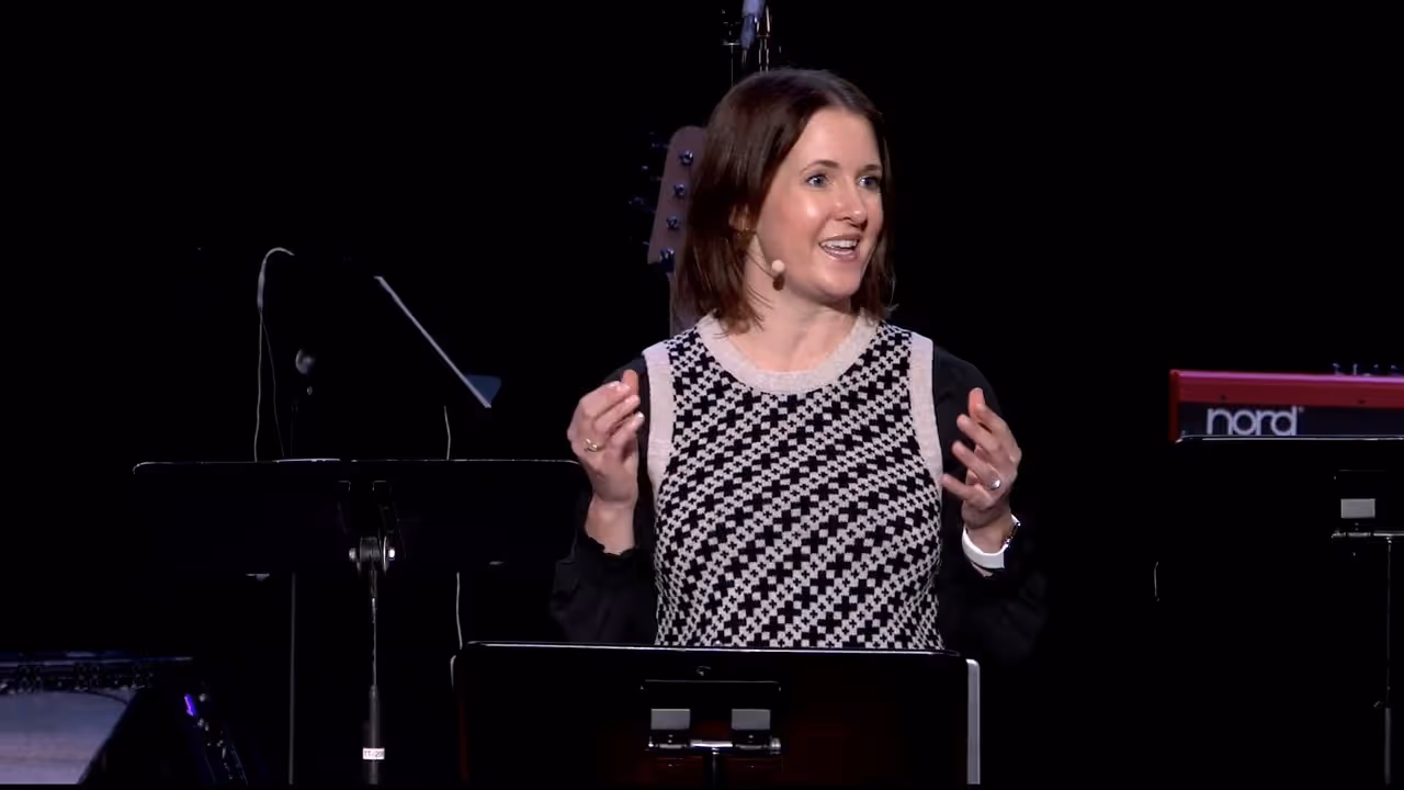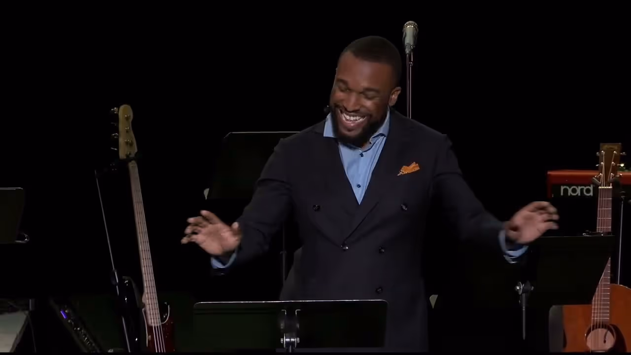 People conversing under purple stage lighting at an event or performanceModern city skyline with inspirational text "Be Thou My Vision".