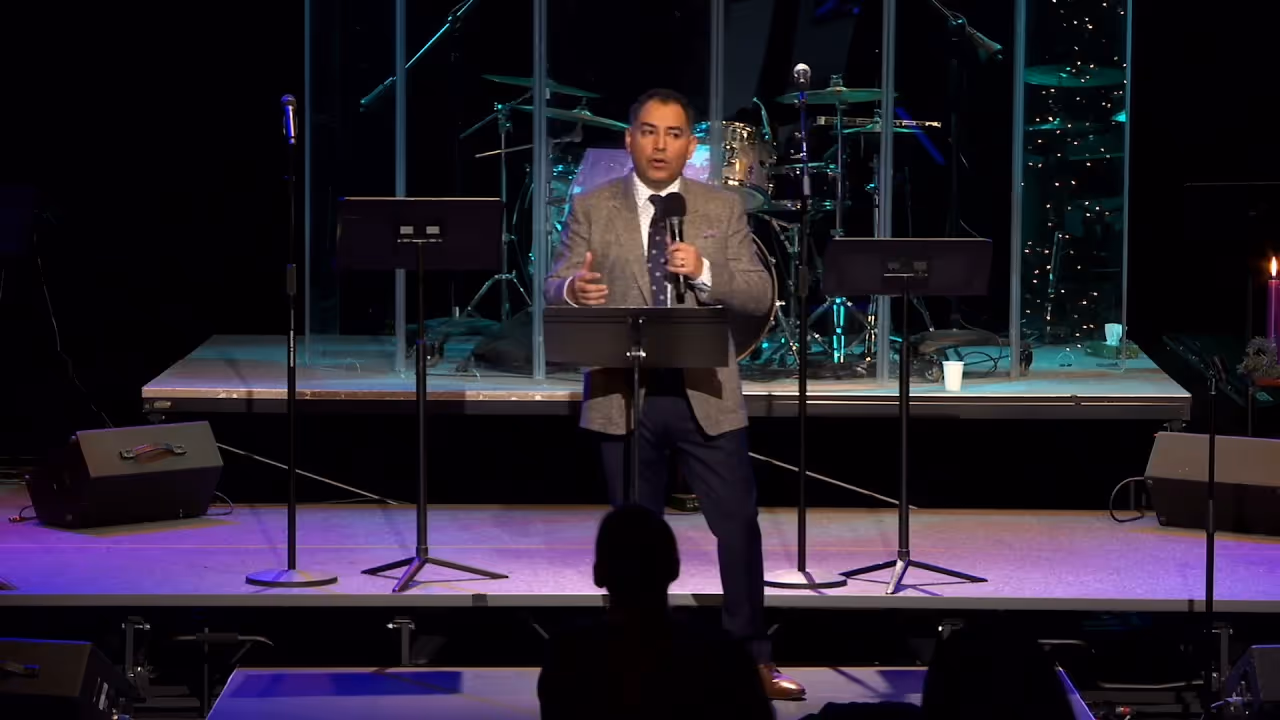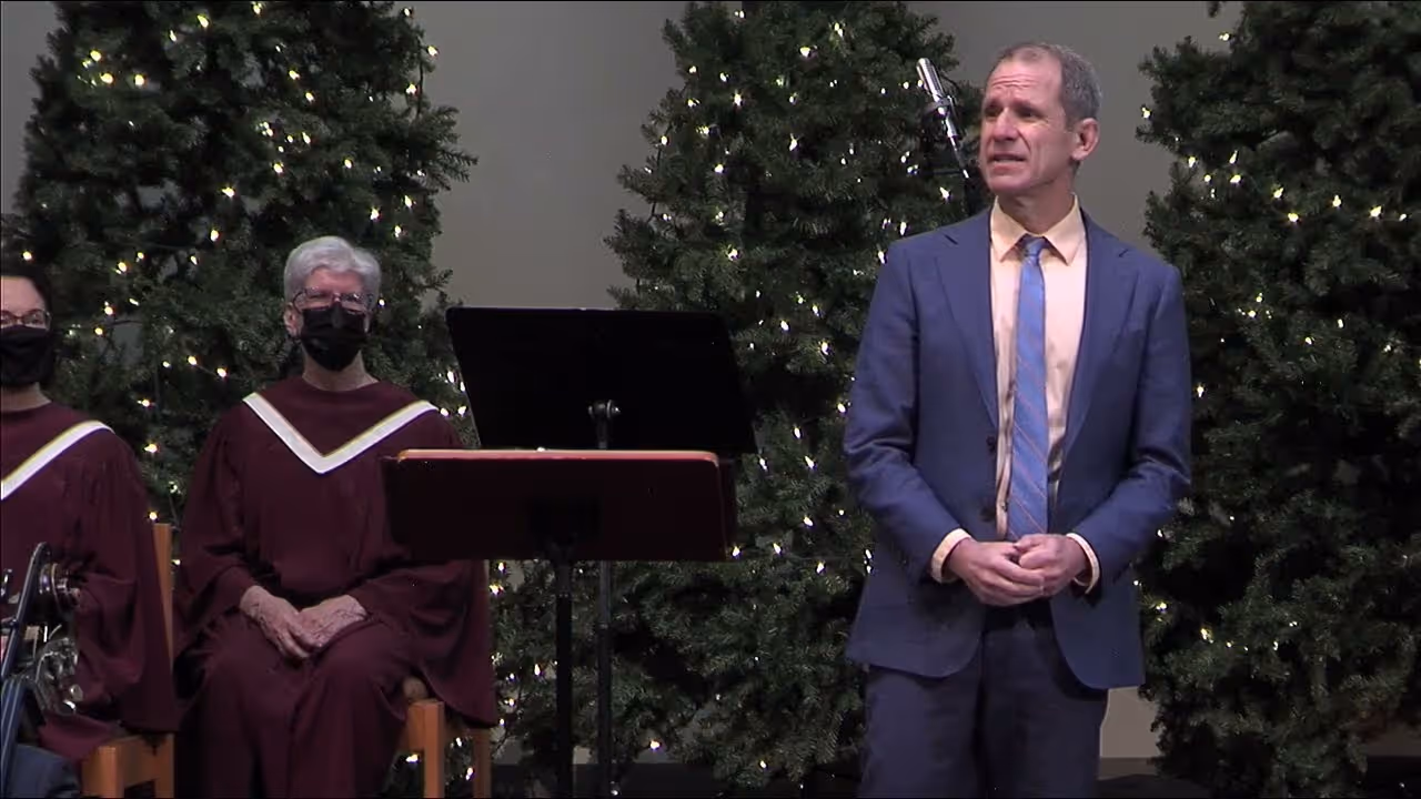 People conversing under purple stage lighting at an event or performanceNeon "Fear Not" text over starry night mountain landscape, Christmas sermon.