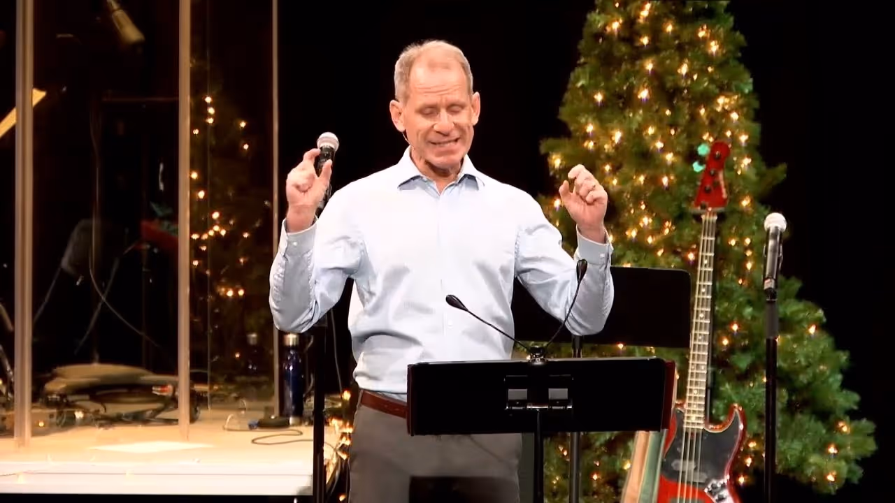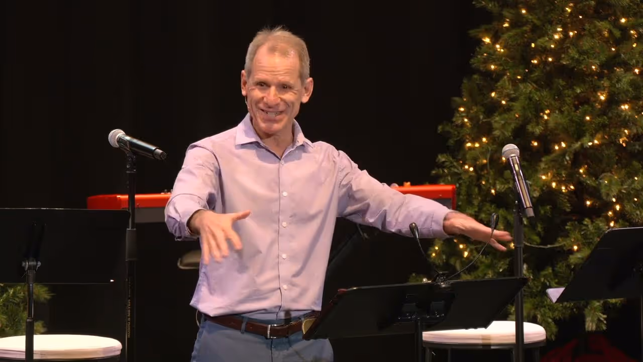People conversing under purple stage lighting at an event or performanceChristmas graphic with nativity scenes and art deco style typography.