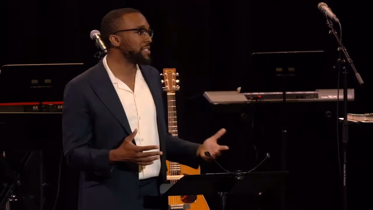 People conversing under purple stage lighting at an event or performanceAerial view of suburban neighborhood with red "Just Neighbors" logo.