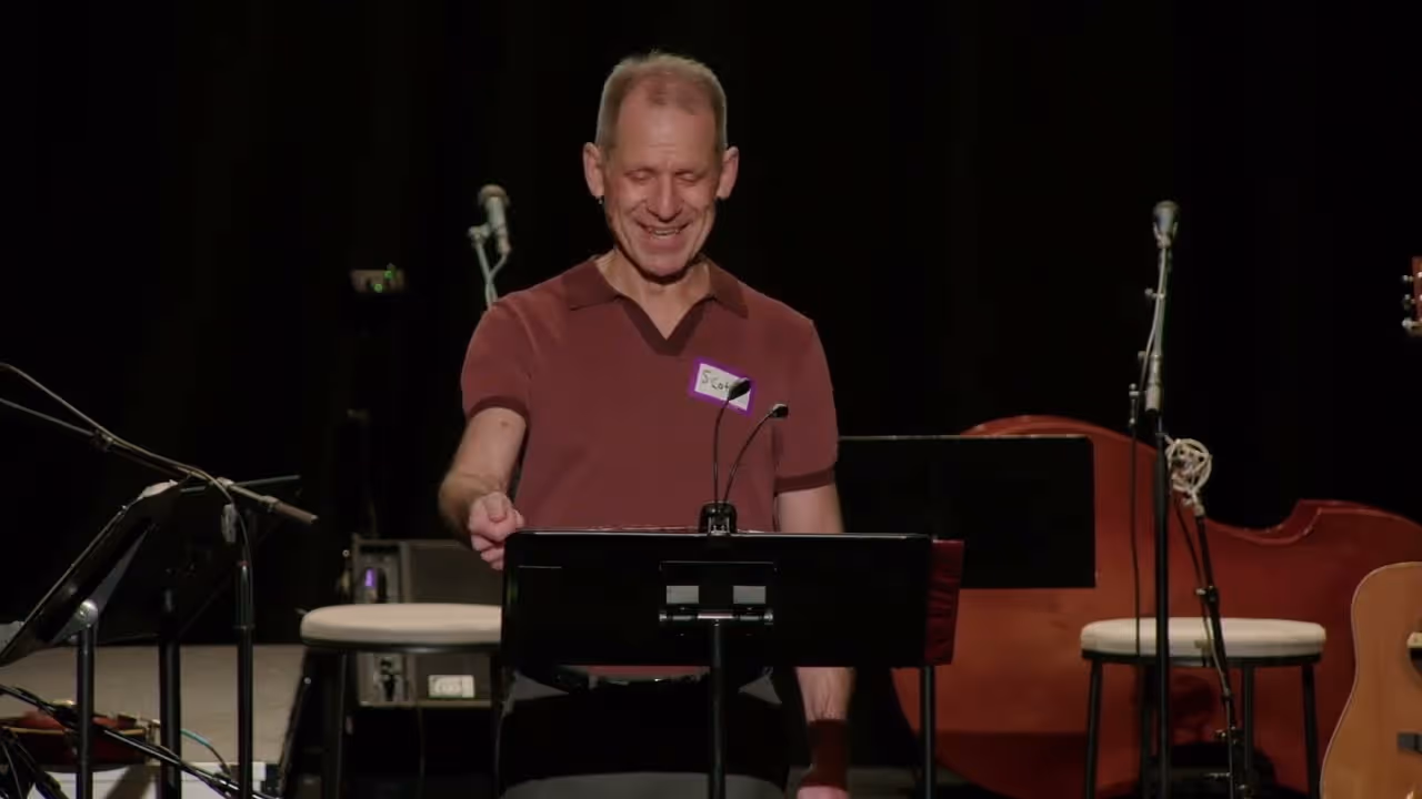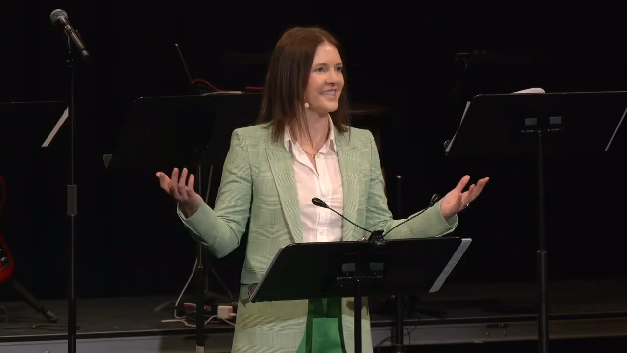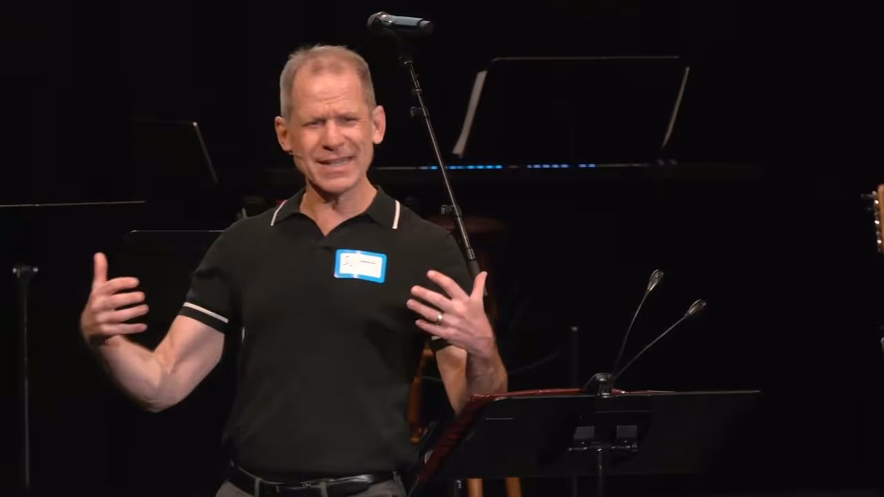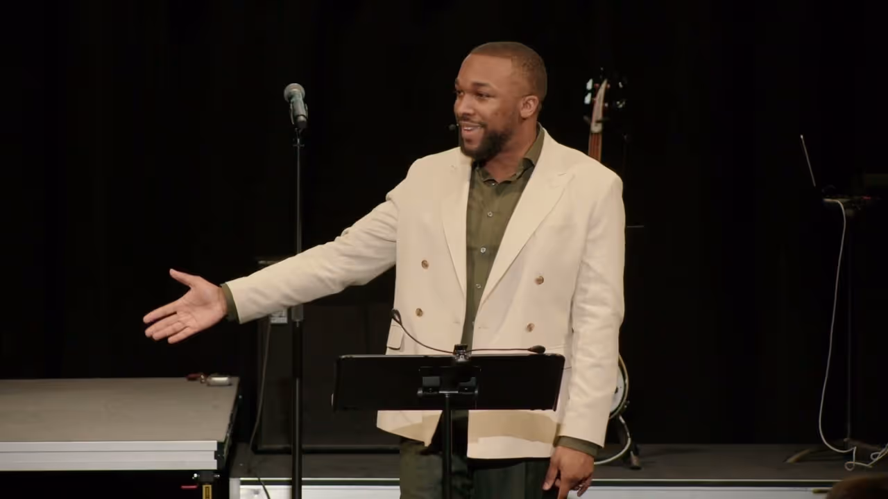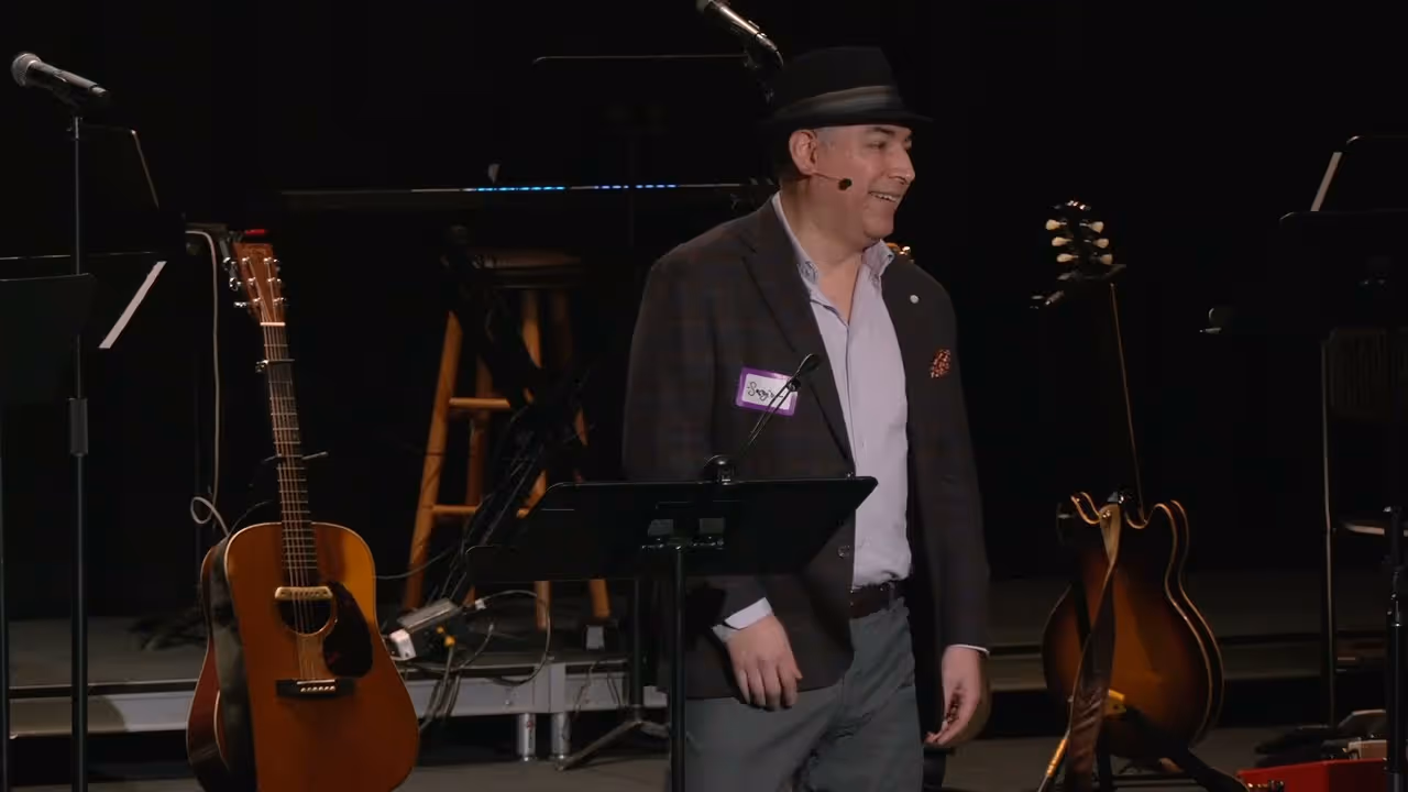 People conversing under purple stage lighting at an event or performanceLoss is Gain text art with biblical references on distressed background.