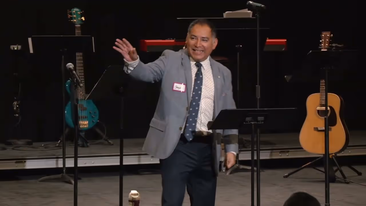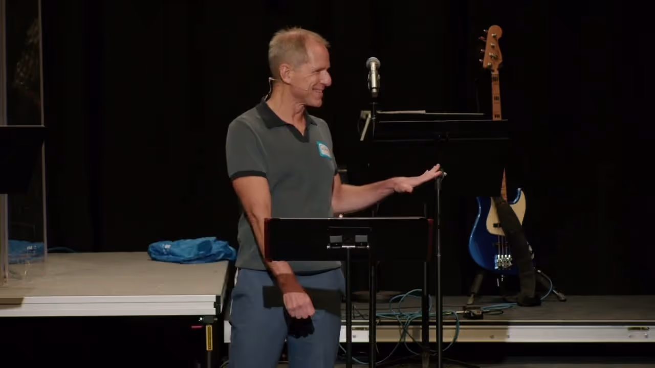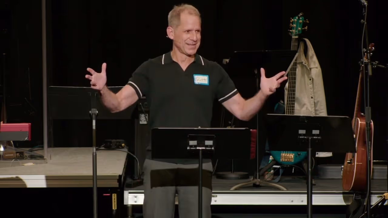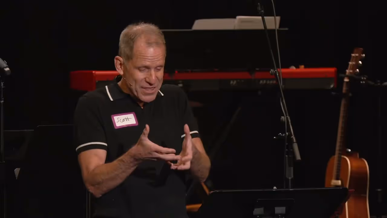 People conversing under purple stage lighting at an event or performanceMarked by Love sermon series graphic with heart and biblical reference.