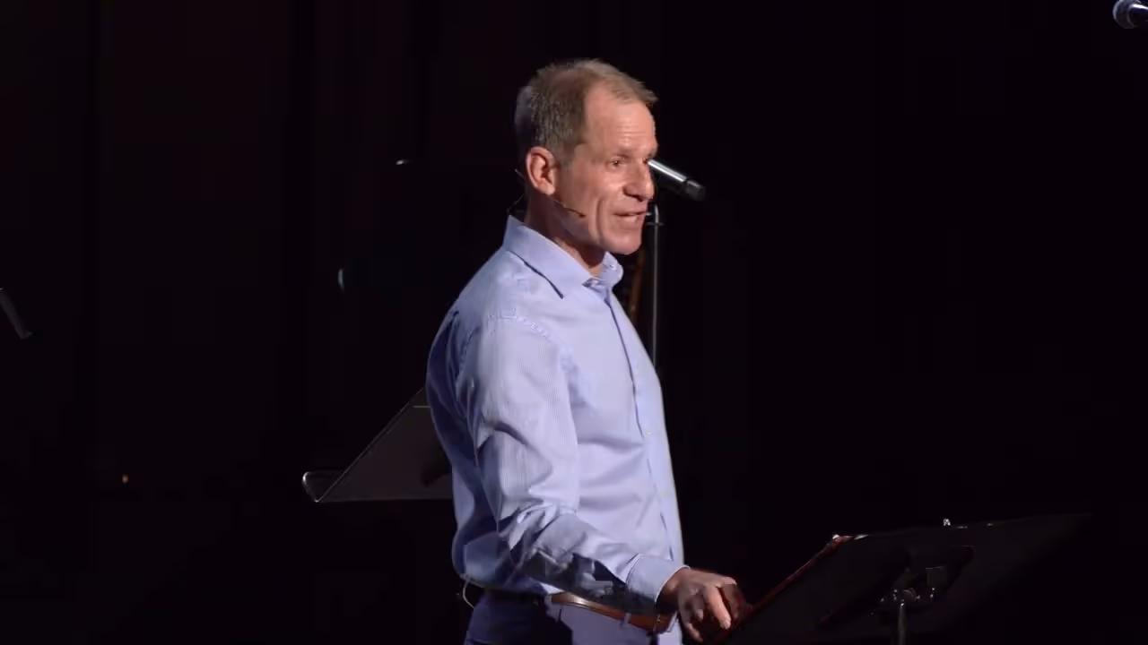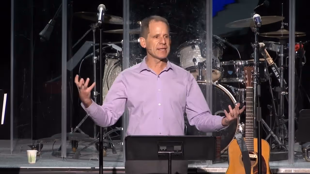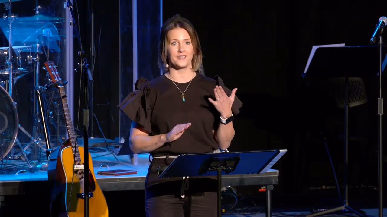 People conversing under purple stage lighting at an event or performanceRomans 8 sermon series promotional graphic with gradient background.