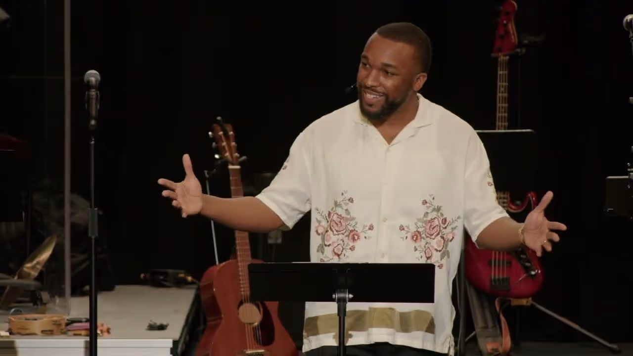 People conversing under purple stage lighting at an event or performanceTransform sermon graphic with blue watercolor waves and yellow text.