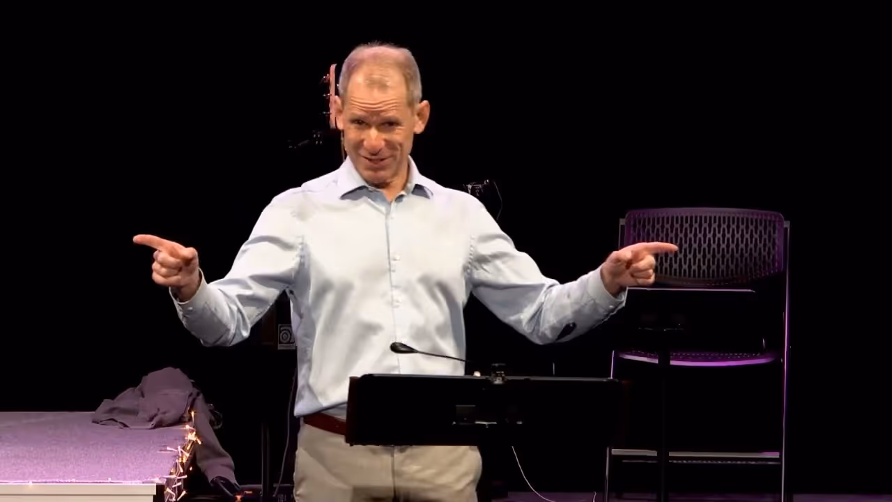 People conversing under purple stage lighting at an event or performanceJesus preaching to crowd, contrasting 'You have heard' with divine message.